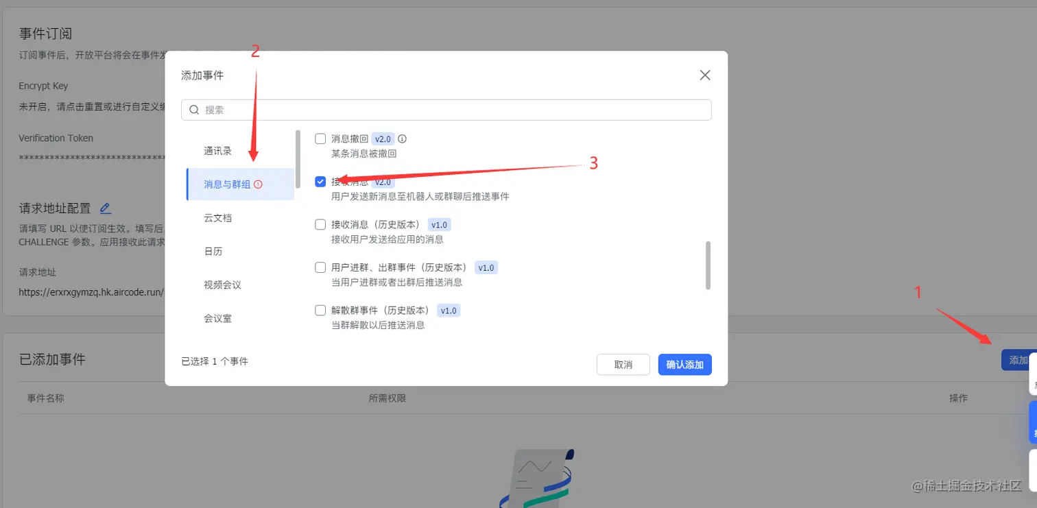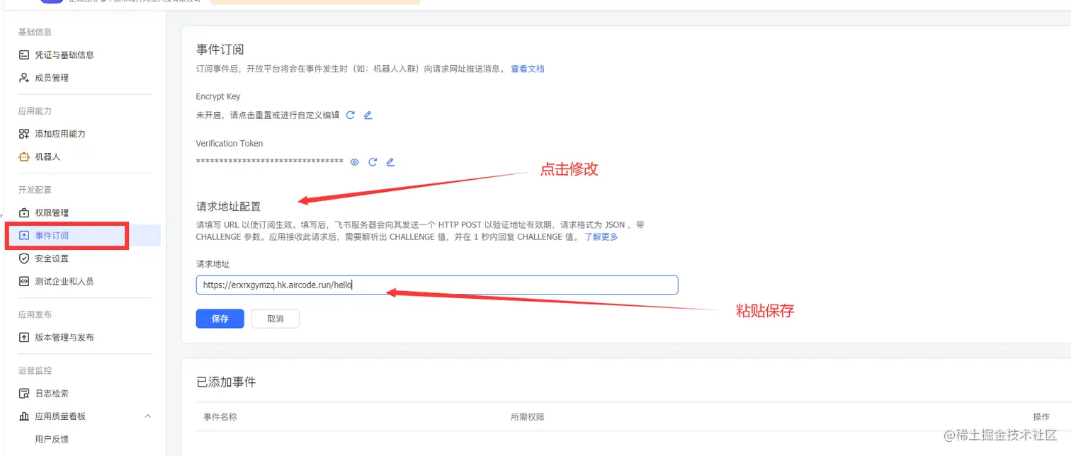 开启之后,再返回AirCode ,复制函数的调用地址,然后再返回飞书,点击事件订阅,把网址粘贴到配置地址。