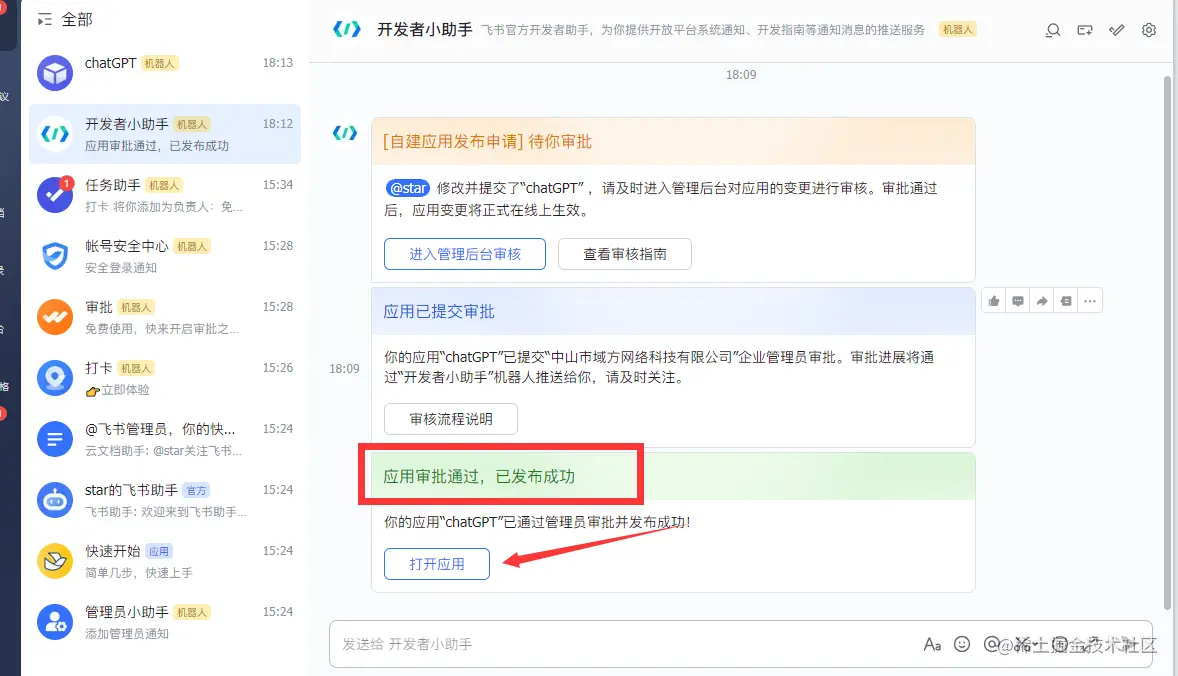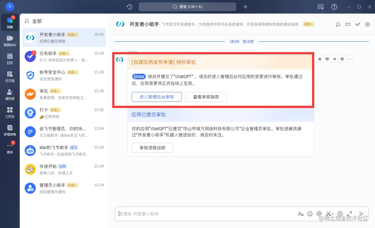 然后你的飞书就会收到消息,点击进入管理后台审核,通过就可以了。