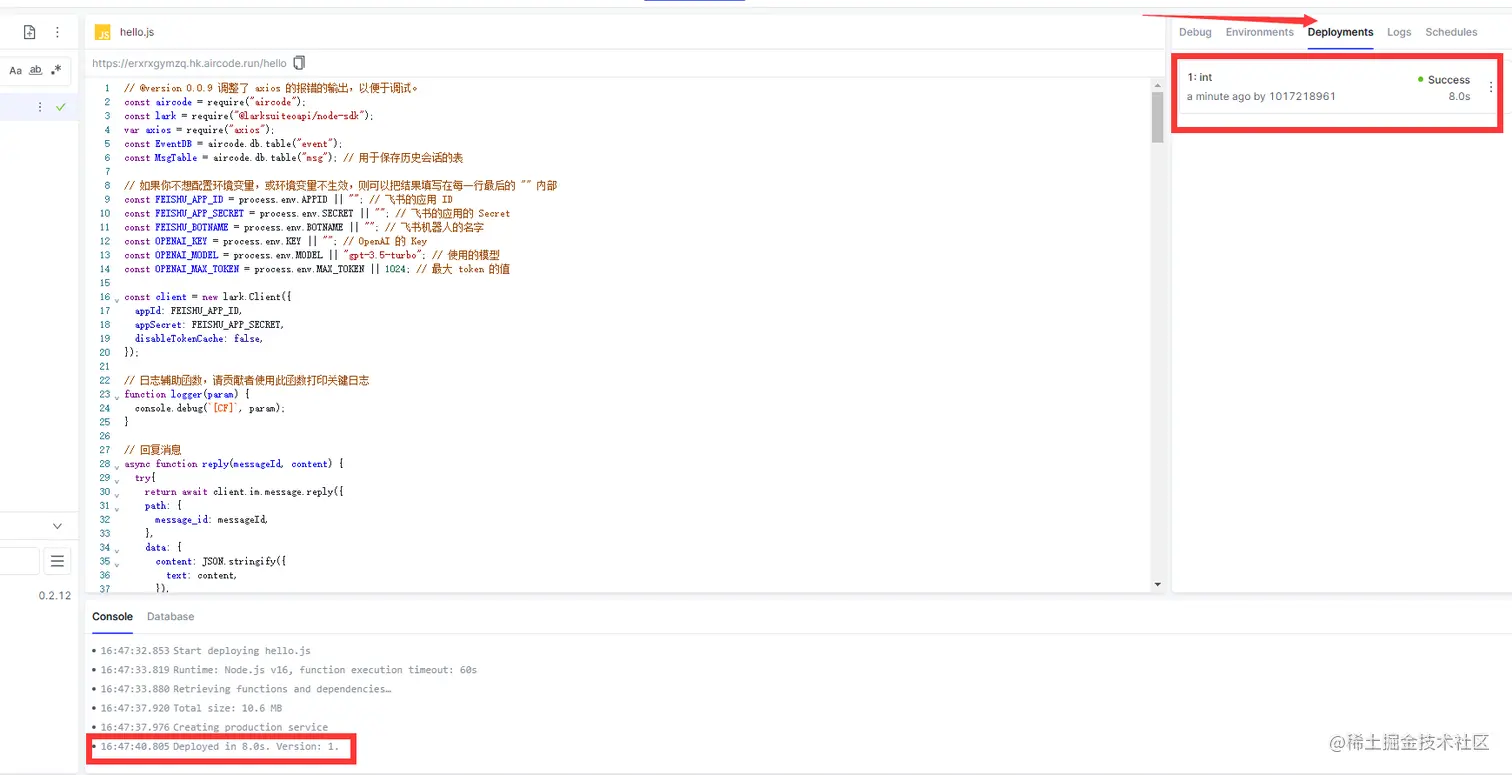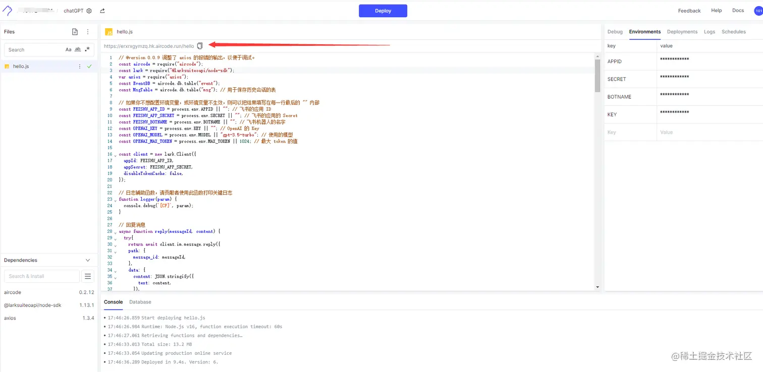 复制代码之后粘贴到Aircode,然后点击Deploy。输入一些日志变更。