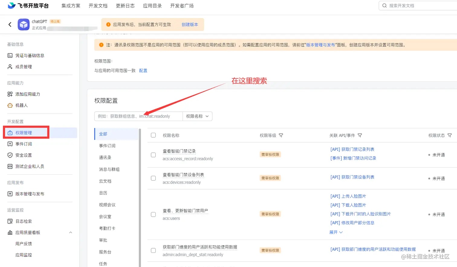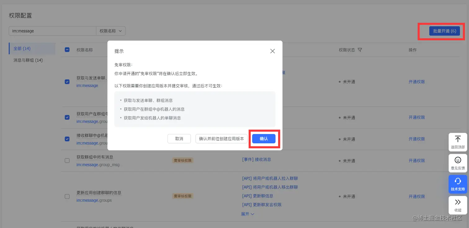 成功之后,打开飞书,配置一下权限,以下6个都要开,有些人账号不一样,某些权限要审核。