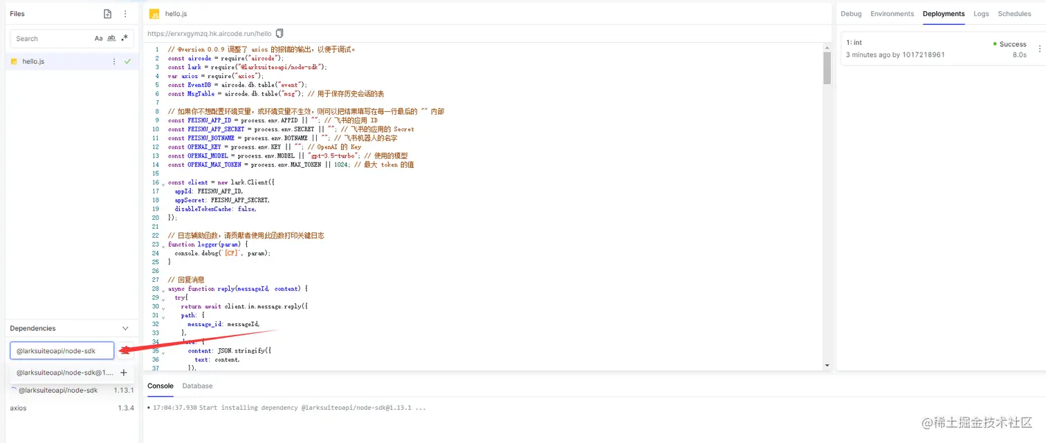 然后在左下角这里搜索 axios和 @larksuiteoapi/node-sdk 然后进行安装,等一会安装完成后再点击Deploy进行布署。