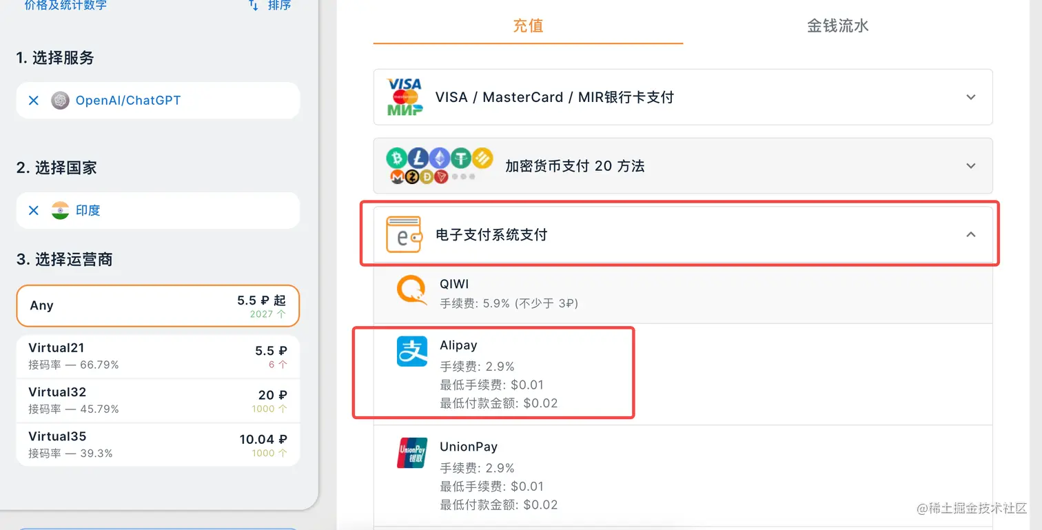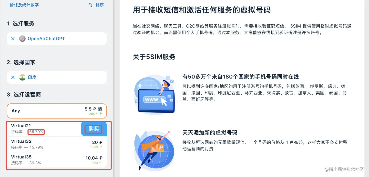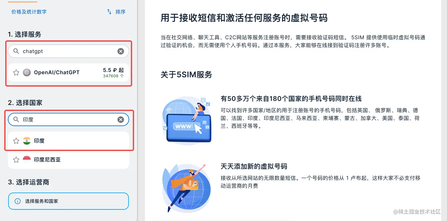 3.登录后在左侧按照上图,输入chatgpt,选择OpenAI/ChatGPT,下面输入印度,选择印度(印度手机号最便宜)