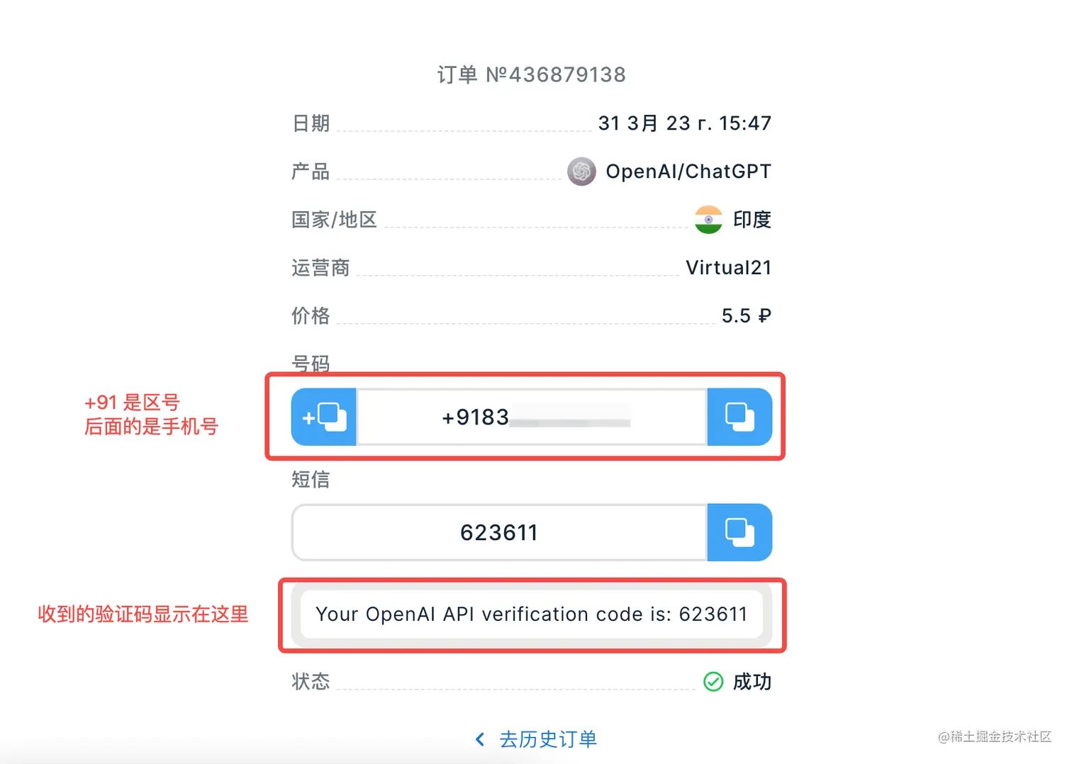 7.支付完成之后,回到网站的订单中就会有一个手机号出现