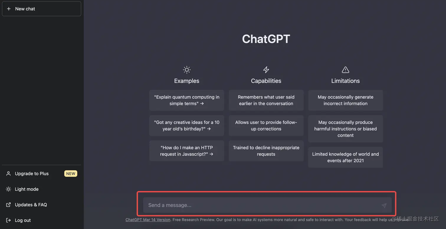 打开 chat.openai.com/chat ,在下面输入框中输入想提问的内容,就会得到ChatGPT的回复