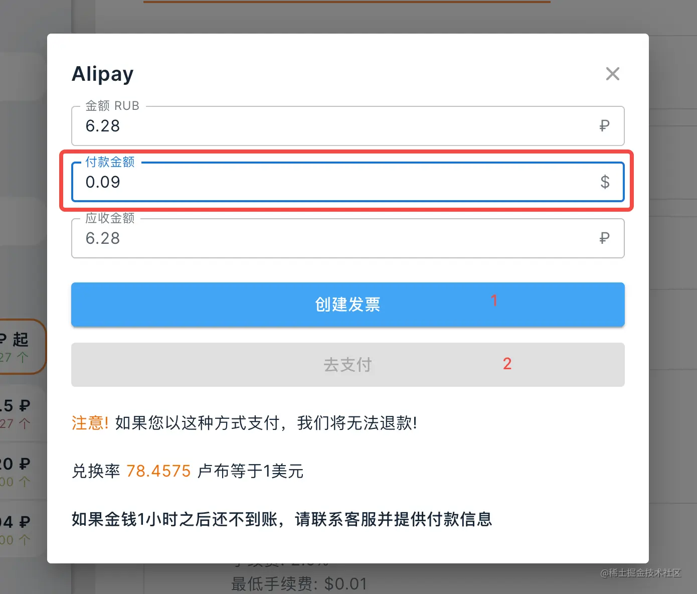 6.在中间的付款金额中输入0.09美元(根据自己选择的手机号价格充值),先点击创建发票,在点击去支付,就会跳转到支付宝二维码扫码界面,使用支付宝扫码支付