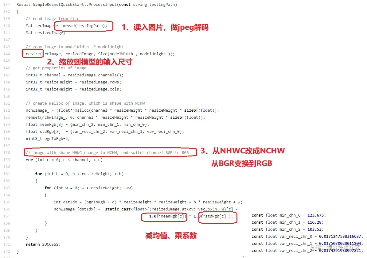 **Resnet50模型,**需要对待推理图片的数据预处理是:缩放到224*224;以RGB的顺序存放;对像素/255.0,变换到[0.0,1.0]范围内;再按三个通道,分别做减均值,乘系数的运算,三个通道的均值是[0.485, 0.456, 0.406],对应系数分别是:[0.229, 0.224, 0.225]。