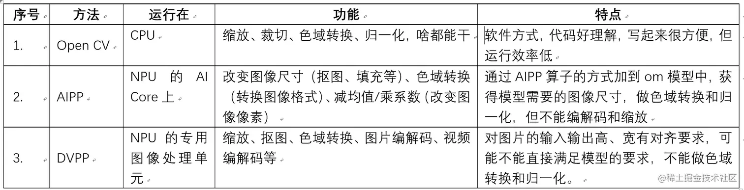本次训练营,勤劳的小虎老师贴心的给大家准备了三种方式,供大家学习和掌握。代码在:gitee.com/ascend/samp… CV;CV+AIPP;DVPP+AIPP。如下表所示: