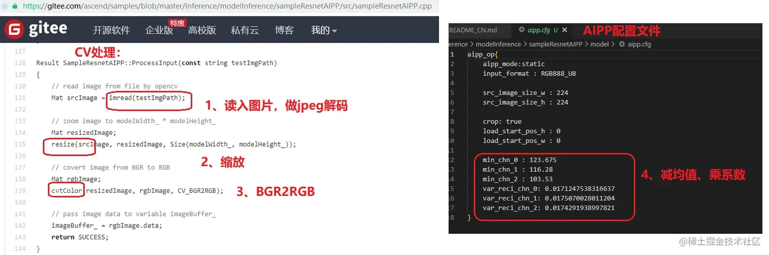 对待推理图片执行模型推理前,需要对图片进行预处理,以满足模型的输入要求。我们可以通过阅读模型训练代码,查看预处理的方法。在做基于Ascend CL模型推理时,通常使用的有OpenCV、AIPP、DVPP这三种方式,或者是它们的混合方式,本文比较了这三种方式的特点,并以Resnet50的pytorch模型为例,结合训练营提供的sample,说明了分别是如何实现预处理的。本文还介绍了AIPP做减均值/乘系数的参数是如何计算的。