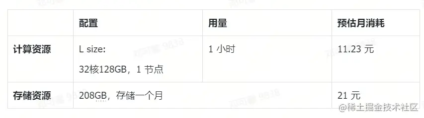 根据本次压测进行预估,消耗计算和存储资源如下表所示,由于 ByteHouse 云数仓版本按使用量计费的能力,在空闲时支持自动关闭计算组并不收取闲置费用,从而能够极大的节省资源。测试完成后,预估的总体消耗约为 31.23 元。