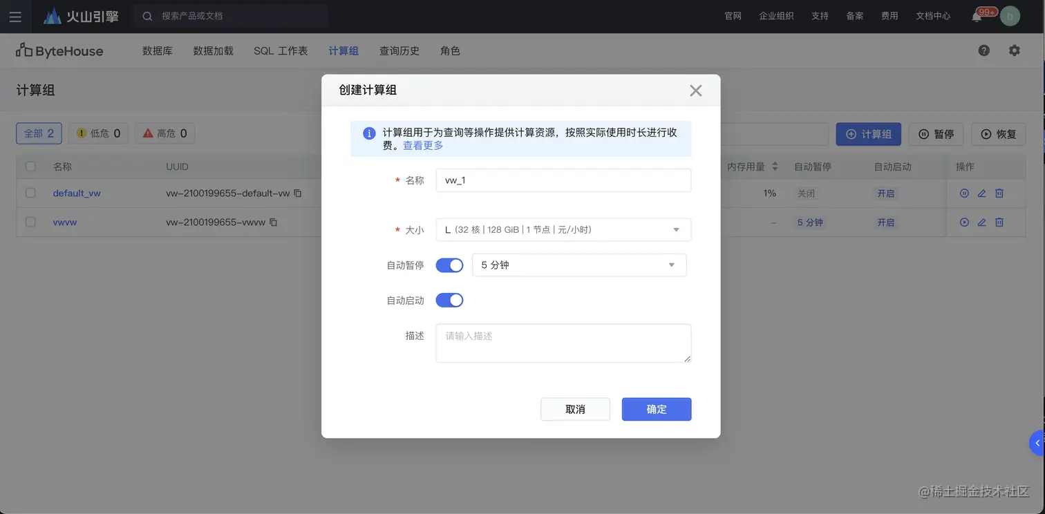 为了方便进行后续的建库建表和查询等操作,首先在 ByteHouse 控制台创建型号为 L 的计算组,如下图所示