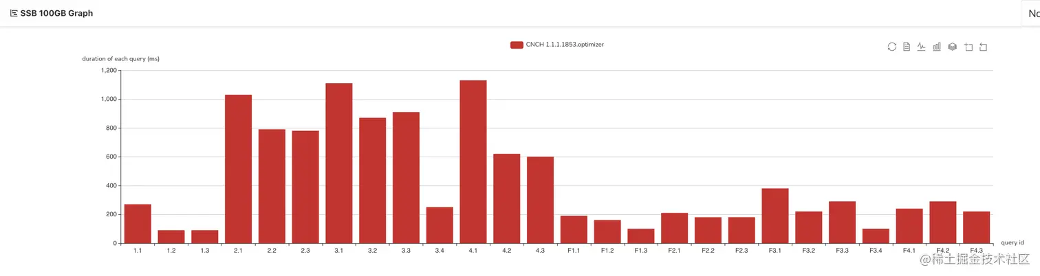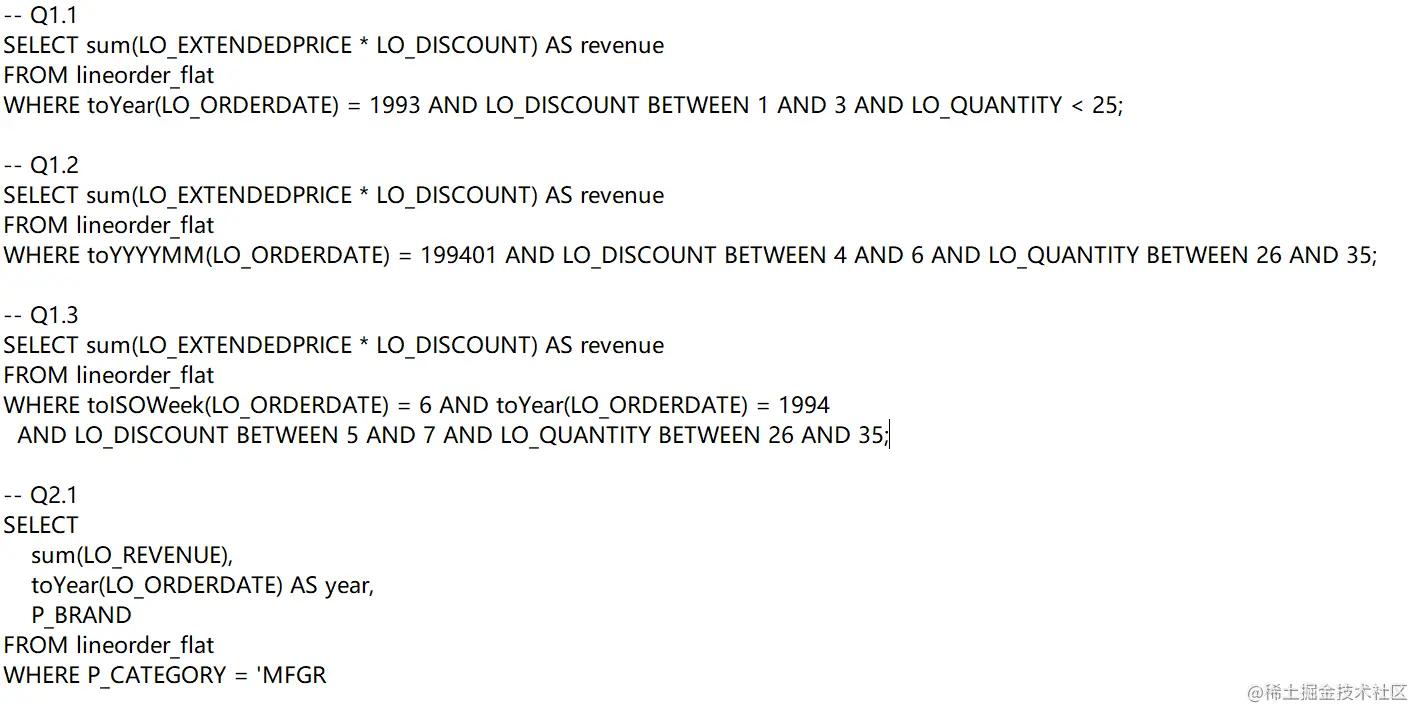 通过执行 SSB 的 13 条查询语句,对于多表关联和排序等场景进行性能测试。查询语句如下所示: