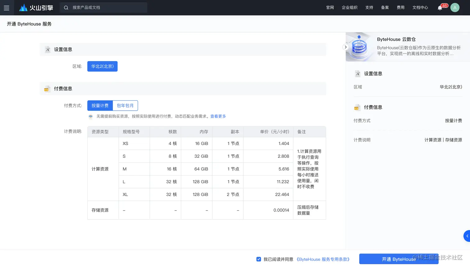 访问ByteHouse 云数仓火山引擎官网,注册火山引擎账户,完成实名认证后,即可登录到产品控制台。开通产品进行测试,目前 ByteHouse 支持包年包月和按量付费两种模式的实例,便于您根据业务需求进行选择。