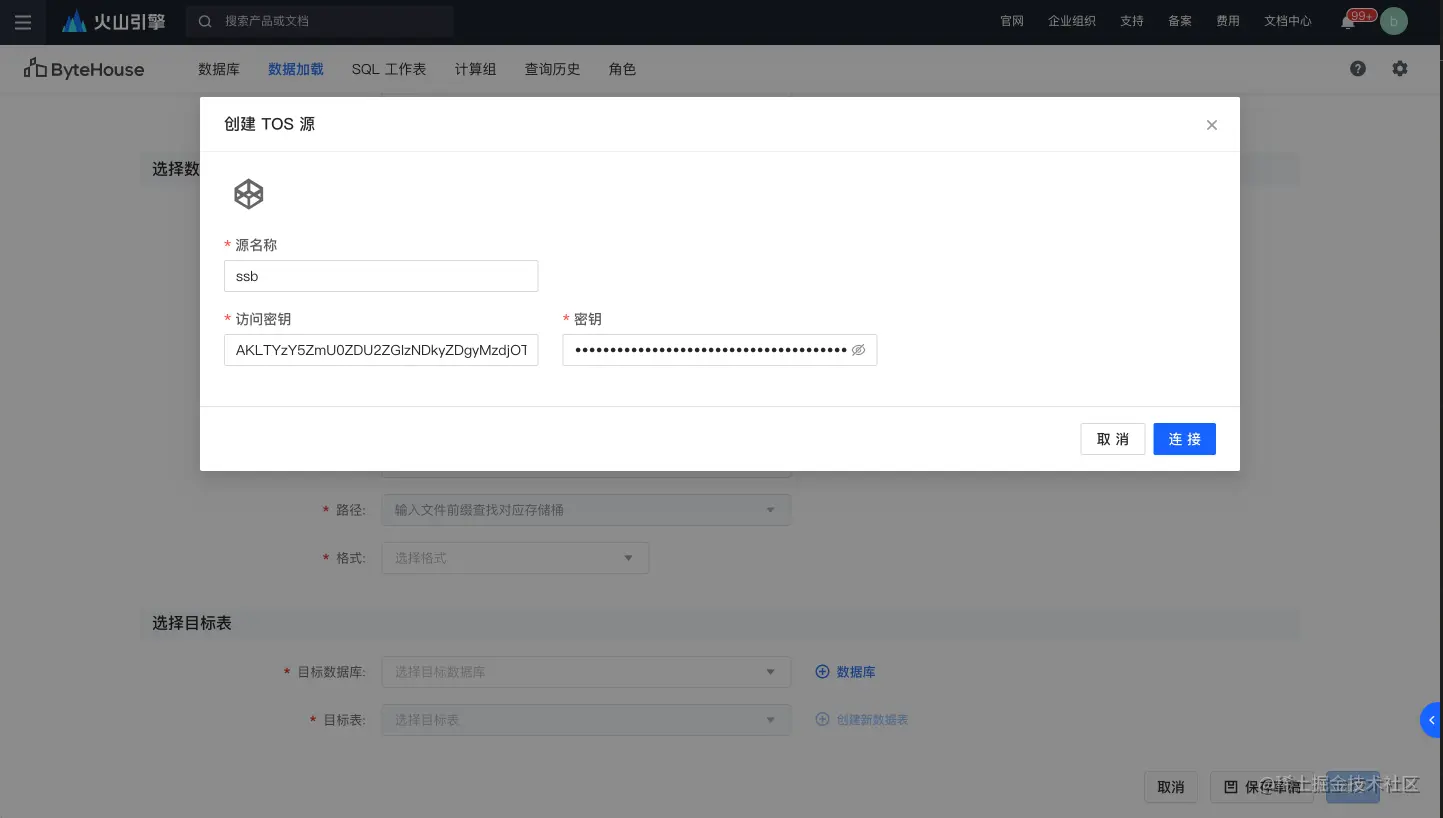 首先在数据加载模块,新建对象存储数据源,并配置对应的秘钥连接火山引擎对象存储