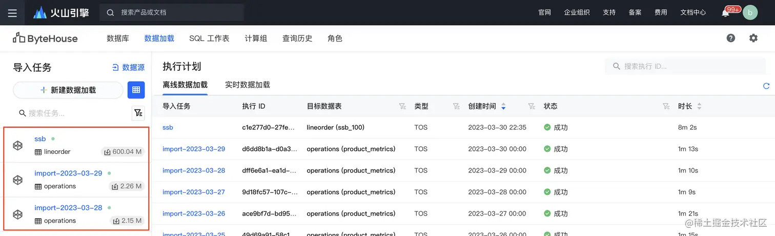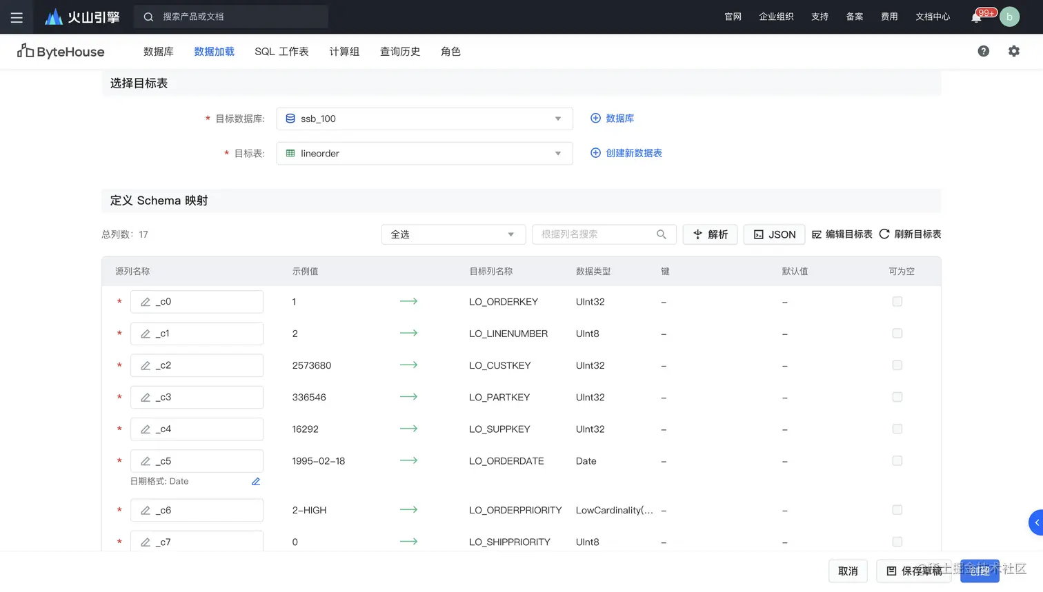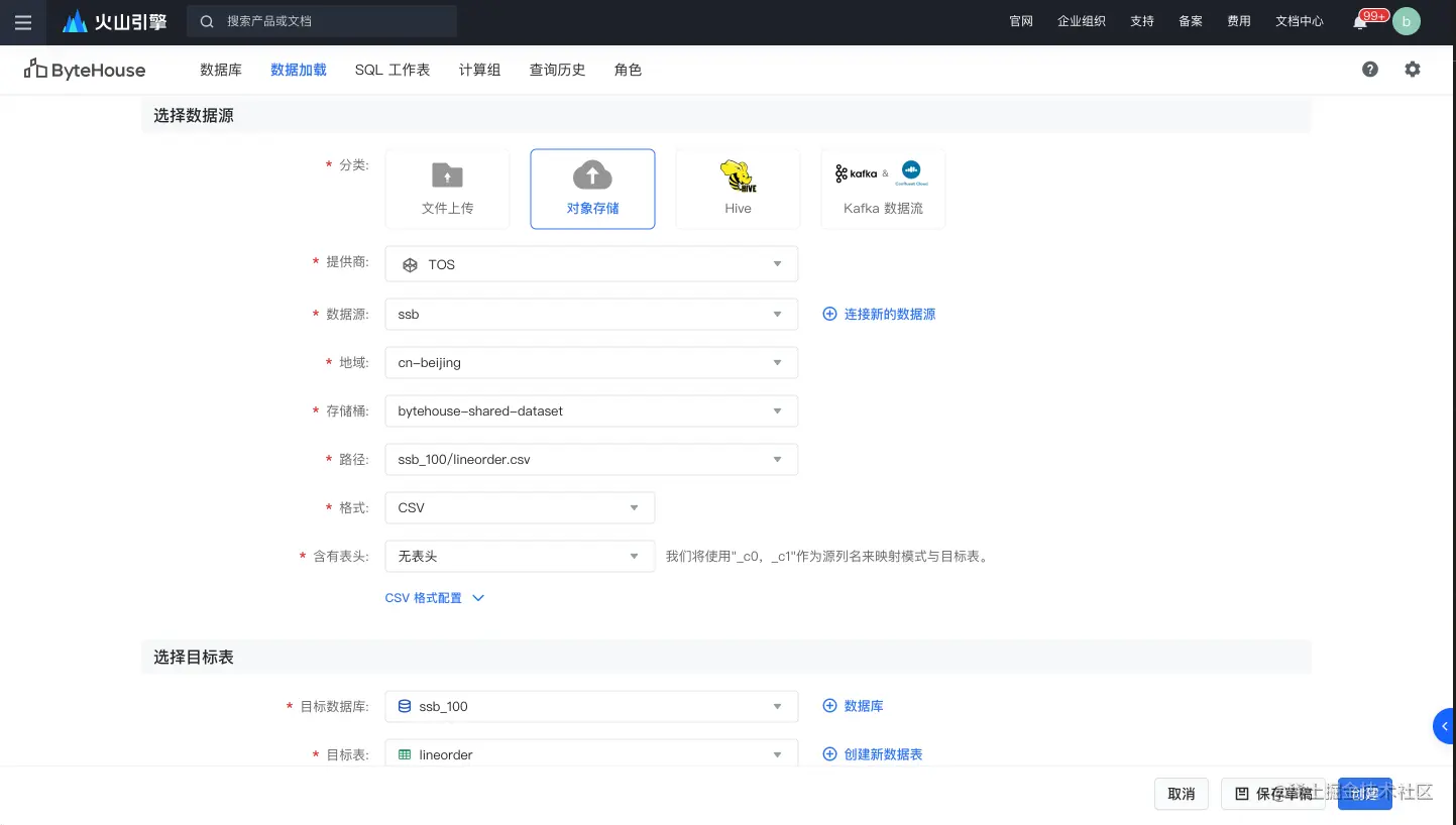 通过预先生成 SSB_100 GB 的数据集并存储在对象存储(如 AWS S3 或者 火山引擎 TOS),我们可以方便且快速的将数据导入到 ByteHouse 中进行分析。本次实践中通过配置 火山引擎 TOS 的数据源对数据进行导入。