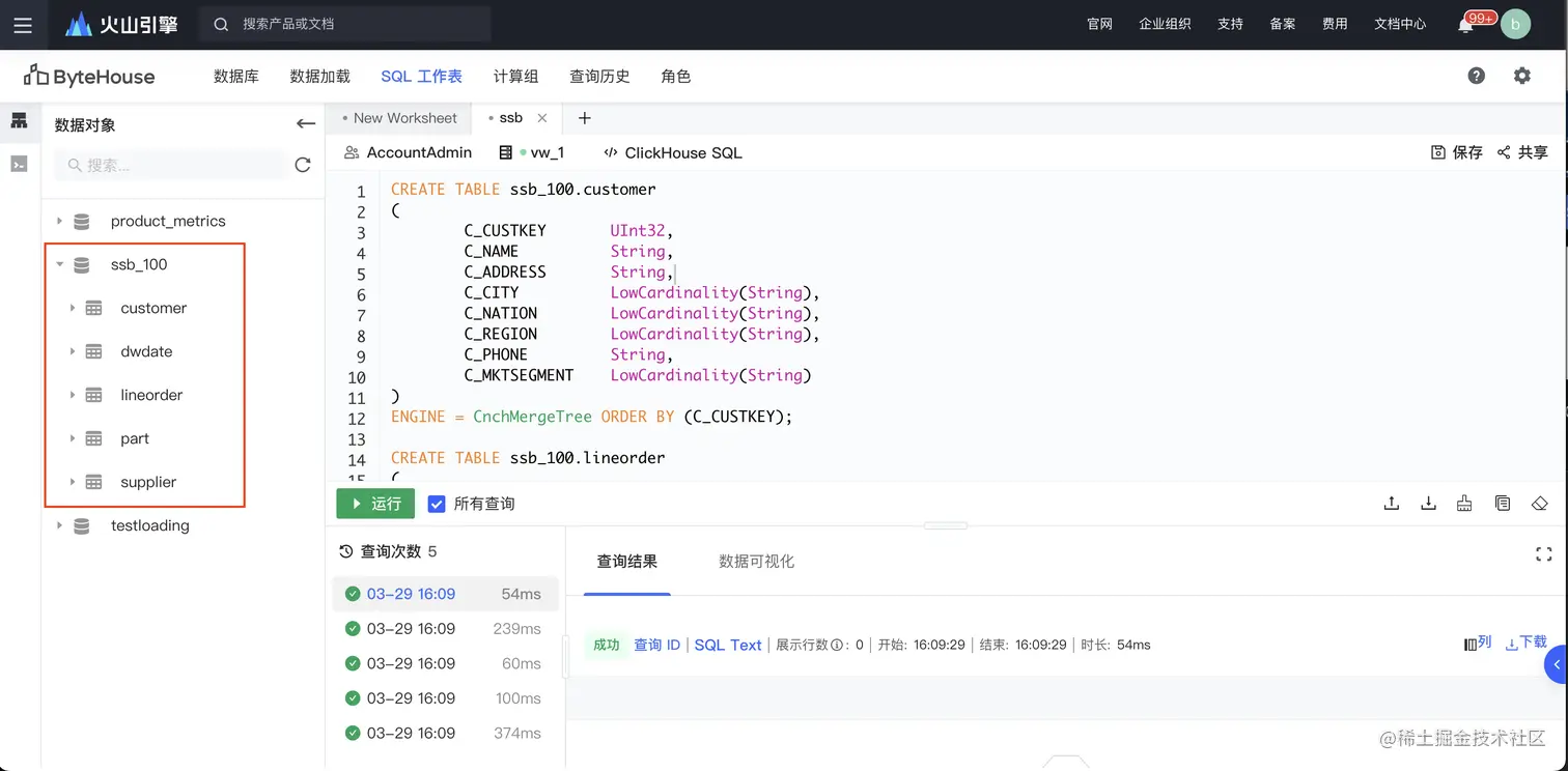 SQL 执行完毕后,在控制台左侧对应的数据对象页面会展示出创建完成的五个工作表,分别为 customer,dwdate,lineorder以及part 和 supplier