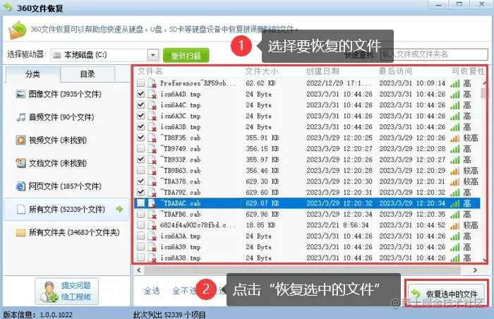 3.在扫描结果中选择需要恢复的文件,并点击 【恢复选中的文件】 。