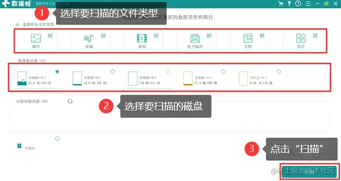 2.选择要扫描的文件类型和驱动器后点击 【开始扫描】 ;