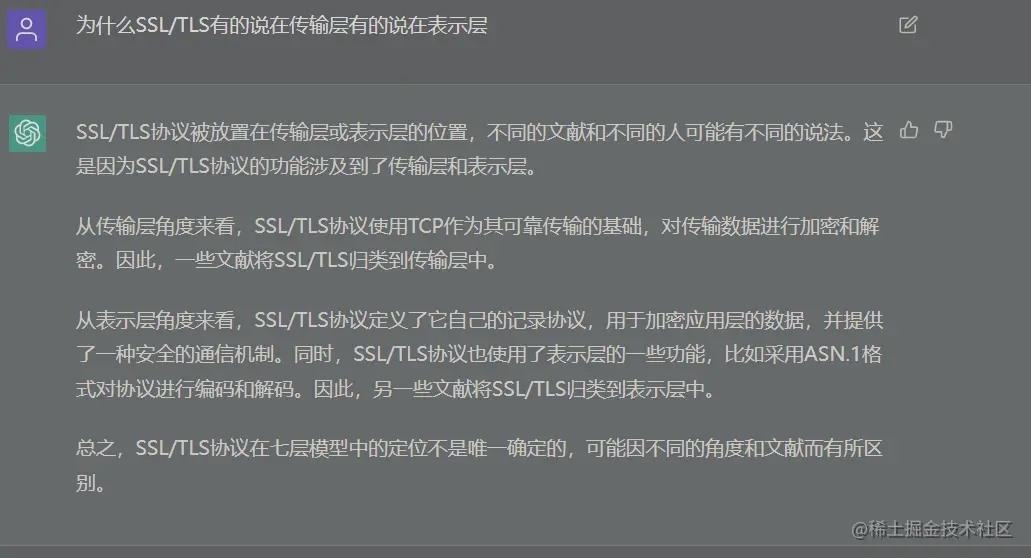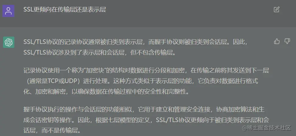 SSL是在传输层吗?不过有些人说是在表示层与会话层?究竟是在哪一层呢?看看下面chatgpt的回答: