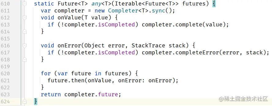 - Future.any 实际就是一个 Completer,N 个 Future 叠加在一起,谁先完成算谁的。