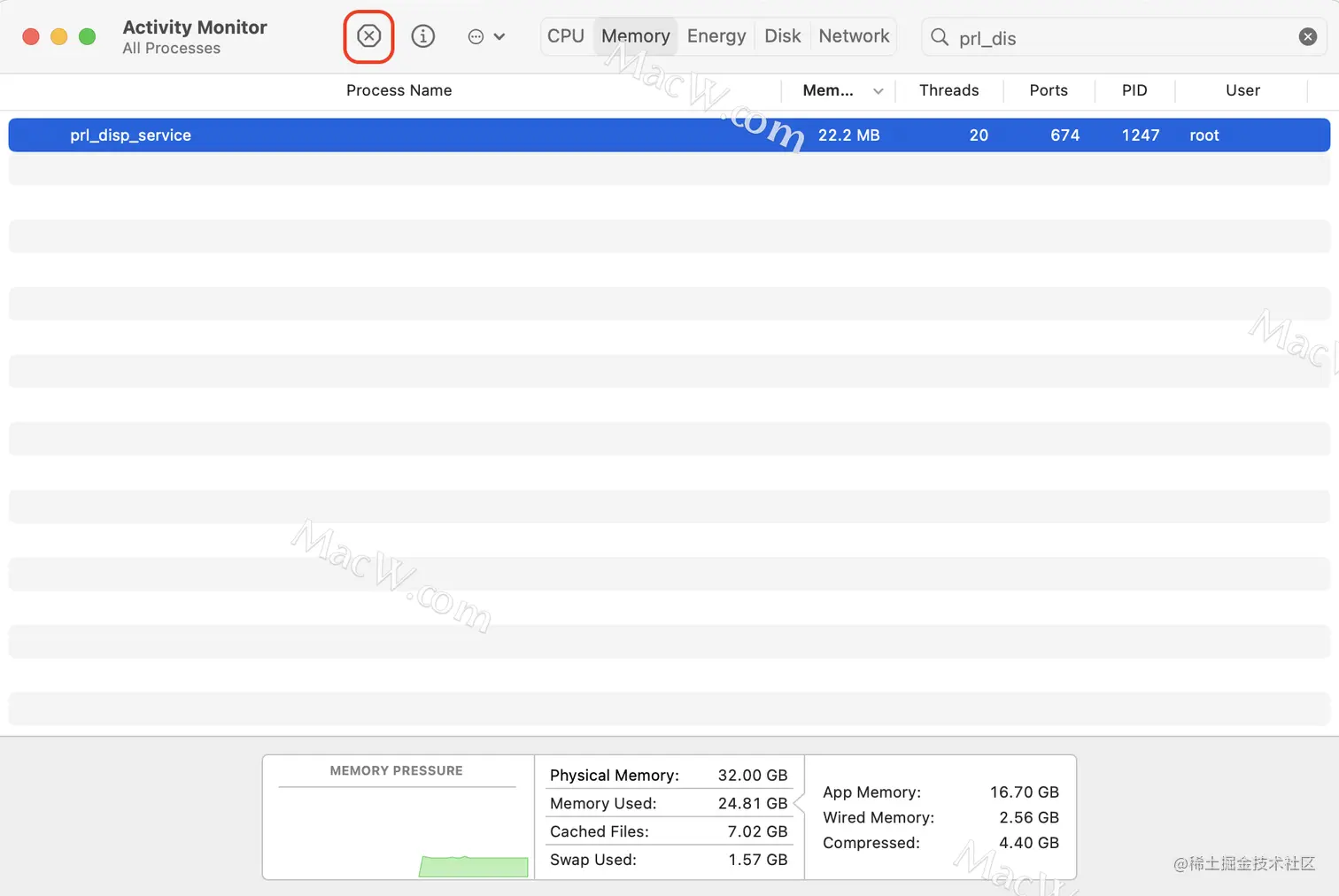 然后打开活动监视器。应用程序,并确保prl_disp_service进程退出。如果没有,单击齿轮图标>选择退出。