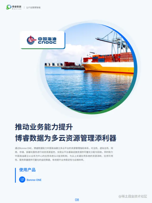 作为Bonree ONE首批用户,中国海油多云资源监控与治理案例落地即荣获中国电子学会发年度优秀实践奖,则从另一个角度展示了Bonree ONE对业务的赋能与对企业发展的推动作用。