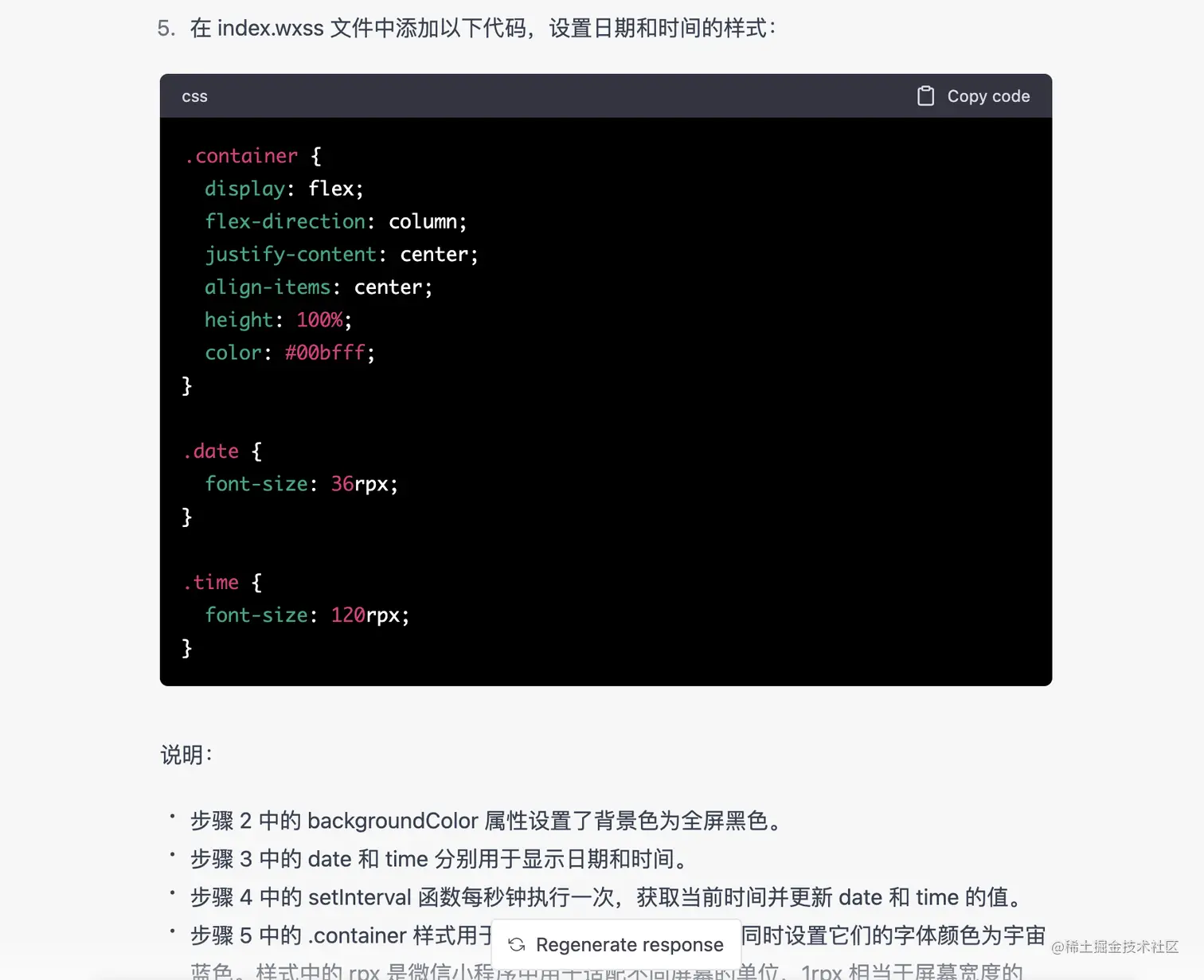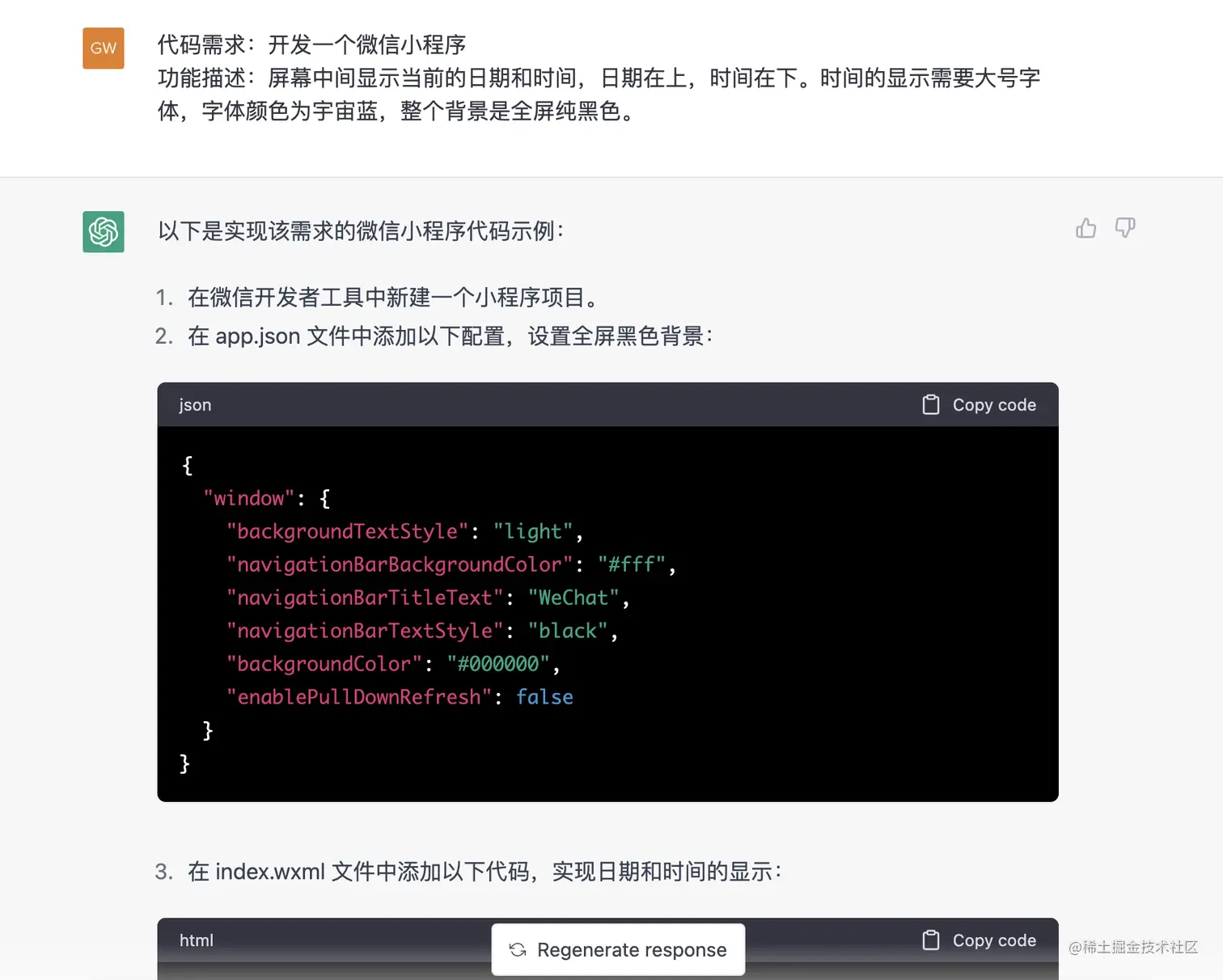 我这里为了让整个流程更简单一些,我直接让 ChatGPT 帮我生成一个时钟小程序,能够以大号字体显示当前的时间,另外我希望时间字体是宇宙蓝,背景是纯黑色。