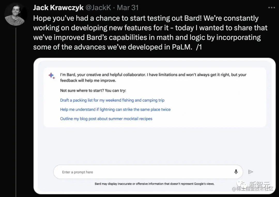 领导 Bard 的一位谷歌高管 Jack Krawczyk 在推特上也介绍了最新的进展。