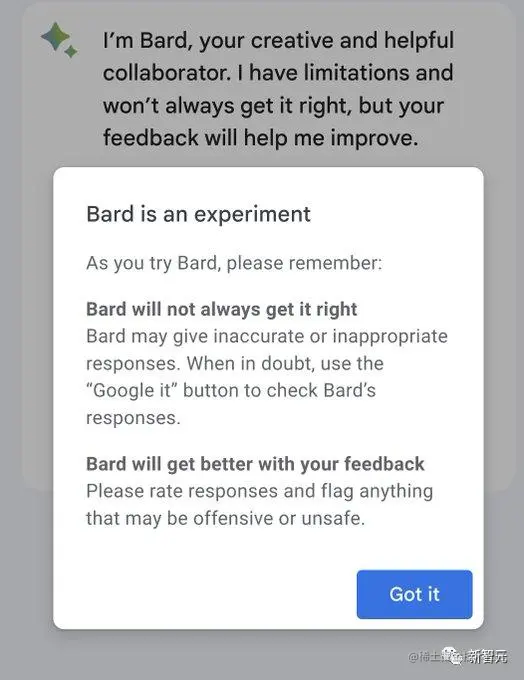 第一次登录 Bard,谷歌就会跟用户打好招呼,弹出消息显示:Bard 并不总是正确的,它会给出不准确或不适当的回答。