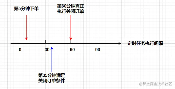 假设30分钟订单超时自动关闭,定时任务的执行间隔时间为30分钟: