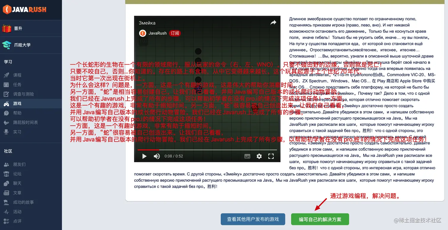 在检索相关资料的时候就想,既然俄罗斯的程序员那么厉害,肯定是有点不同的学习方式。所以小傅哥又检索到了一个网页版的游戏学习编程的课程。地址:javarush.com/ - 体验了下还蛮有趣的。除此注册它会给你一些题目进行作答,判断你是哪个级别的研发,之后给你提供专门的资料。资料分为文档、任务和游戏,游戏的话一个个小故事引导你去学习,比较适合新人。【体验即可,不用付费】举例;javarush.com/quests/lect…