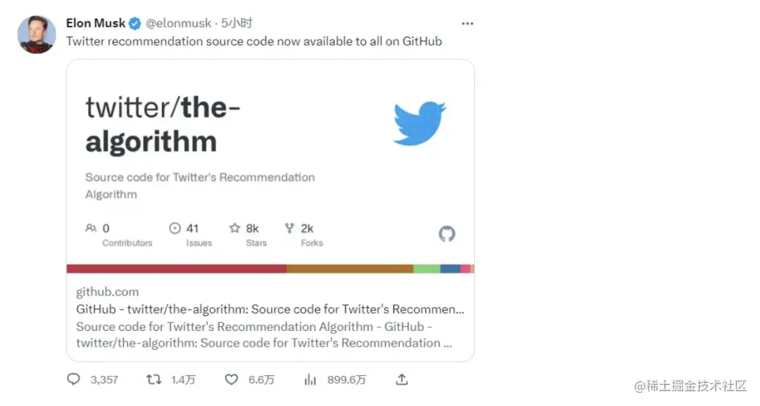 当地时间 3 月 31 日,马斯克宣布Twitter (推特) 算法的开源。该公司在 GitHub 上发布了两个存储库Main repo和ml repo 两个代码仓库,其中涵盖了推荐算法在内的许多推特源代码,包括用来控制用户在 For You 时间线上看到的推文的机制,并发布了一篇博客分享了有关推特算法的更多详细信息。