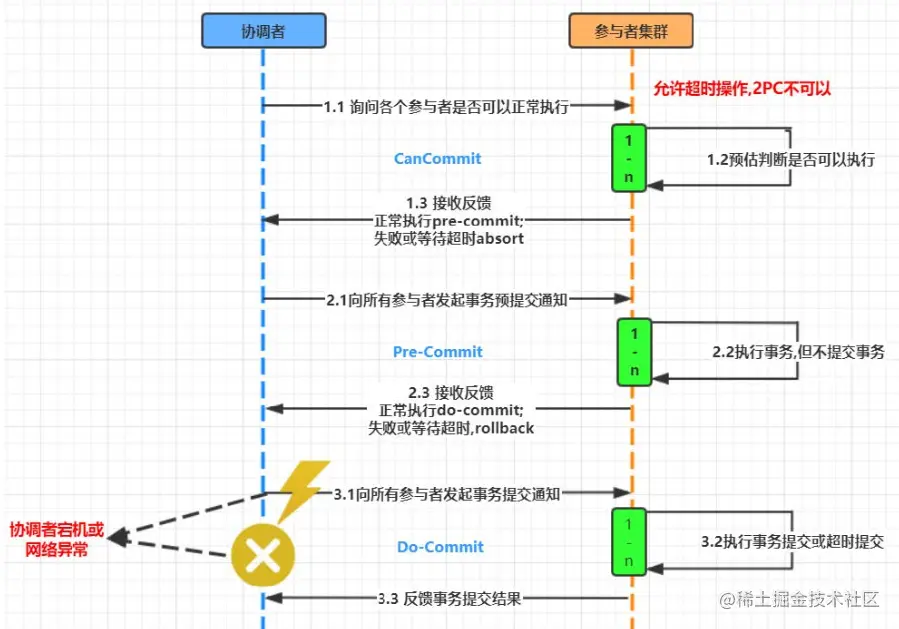 三阶段(3PC)事务是将【执行事务请求】一分为二,新增的【预提交】阶段,这解决了两类问题: