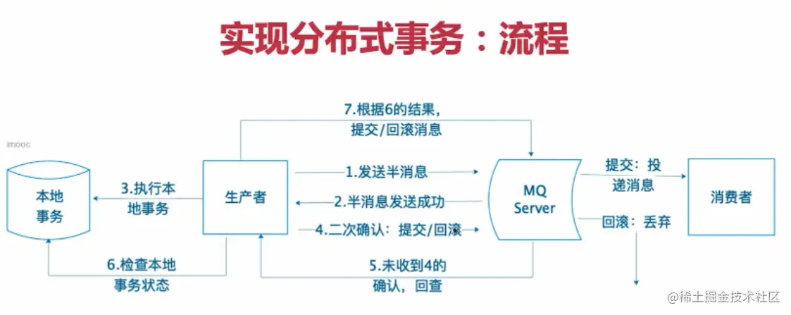 也就是说在业务方法内要向消息队列提交两次请求,一次发送消息和一次确认消息。如果确认消息发送失败了RocketMQ会定期扫描消息集群中的事务消息,这时候发现了Prepared消息,它会向消息发送者确认,所以生产方需要实现一个check接口,RocketMQ会根据发送端设置的策略来决定是回滚还是继续发送确认消息。这样就保证了消息发送与本地事务同时成功或同时失败。