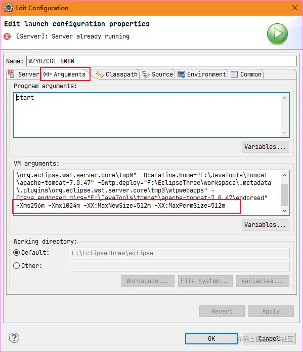 在图中位置添加-Xms256m -Xmx1024m -XX:MaxNewSize=512m -XX:MaxPermSize=512m
