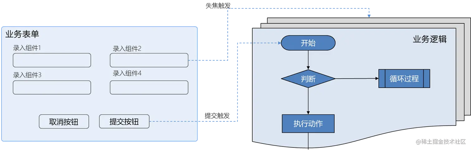 表单作为人机数据交互的入口,提交数据后通过配套的逻辑(一系列原子功能集合),可实现大量的业务场景的功能,组件输入后,失去焦点触发逻辑的调用;通过按钮提交前/后触发逻辑的调用;这里的逻辑可以实现外部接口、原子功能拼装、直线型功能处理、循环执行、触发其他流程功能等,如下图示例: