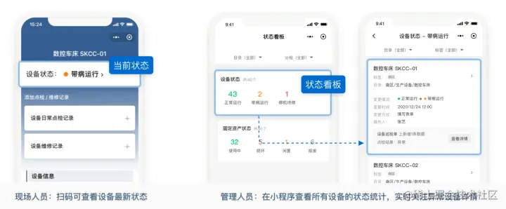 状态看板能帮你实时统计正常和异常设备数量,管理人员可在微信小程序中,查看处于不同状态的设备数量、详情、变更历史。你可以根据实际业务,自定义设备状态组以及对应的规则。