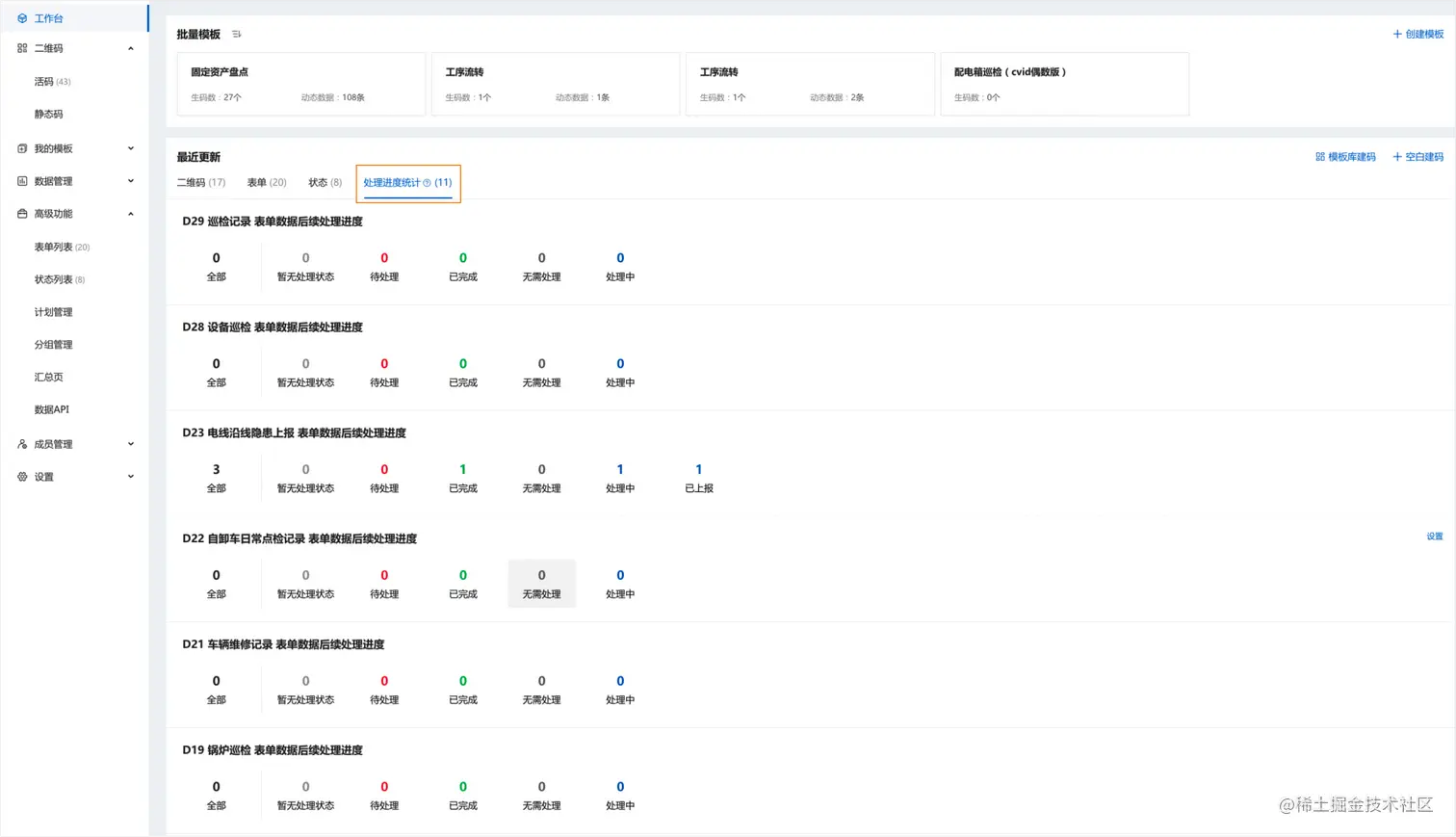 登录电脑后台,在工作台-最近更新中可查看处理进度统计。以表单维度来统计处理进度。
