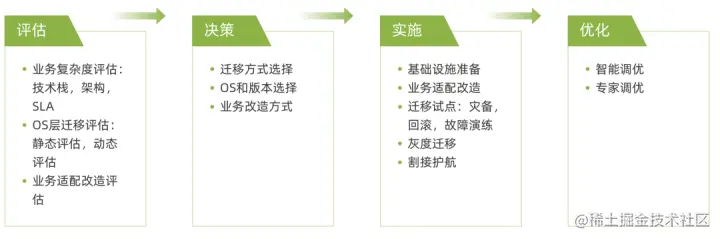 迁移方法论:评估、决策、实施、优化四步迁移法。