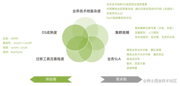 随着各种虚拟化技术,开发语言的繁荣发展,在进行操作系统迁移时会出现多种开发语言,中间件,数据库,虚拟化手段混杂在一起的情况,而平台,业务,产品等不同纬度的诉求也会产生叠加。在这些场景下,操作系统迁移不再是一个单机维度的 OS 切换,而是需要从集群迁移视角来看待,做好全局评估与实施方案,做好灾备,灰度,回滚方案,并结合上层业务调度来进行迁移的系统工程。
