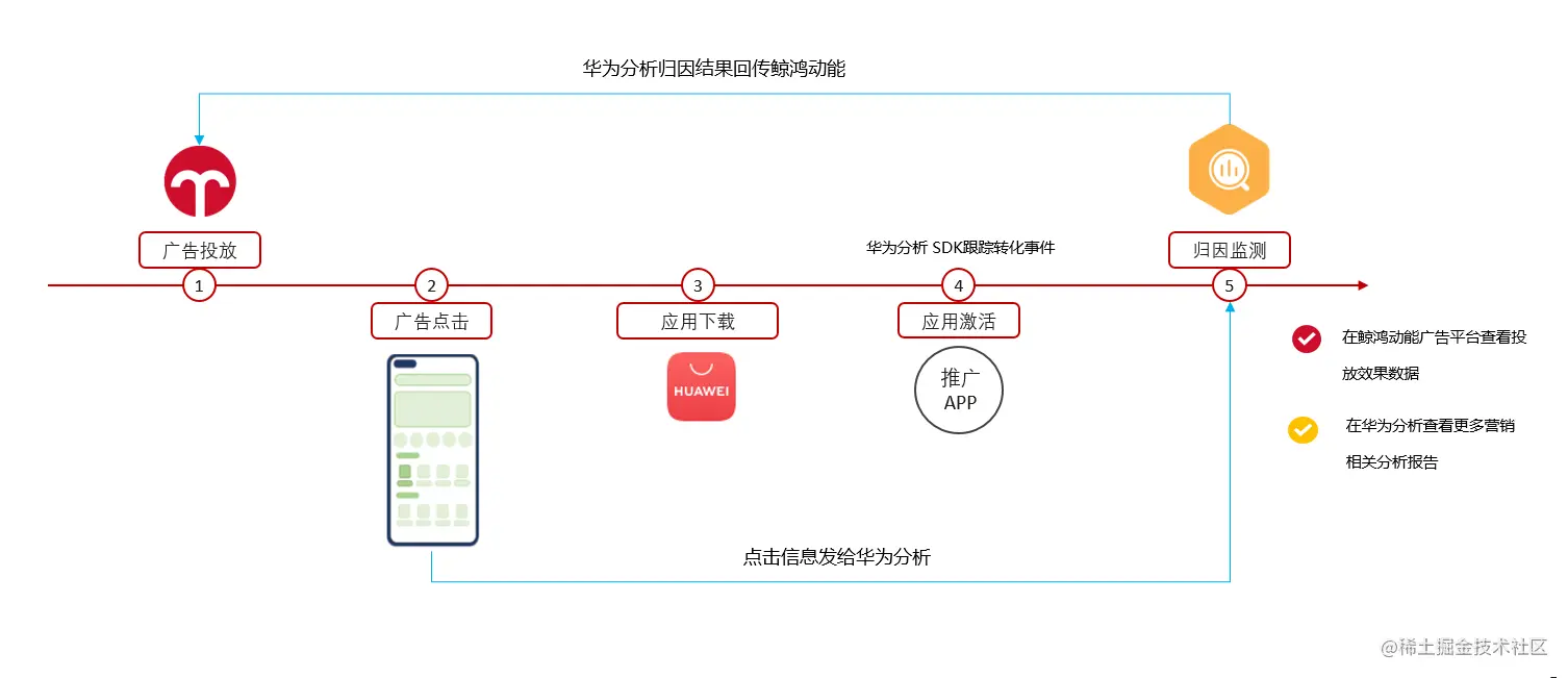 广告主可以通过华为分析服务上报转化事件,华为分析根据归因模型进行归因,并回传至鲸鸿动能广告平台,实现 “曝光、点击、下载、激活、注册、留存、付费、加购”的全链路监测,减少繁杂的数据收集、整理时间,更专注于思考投放策略的调整方向。
