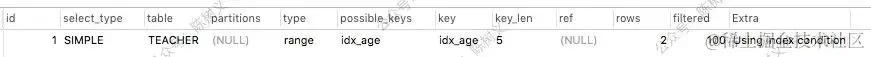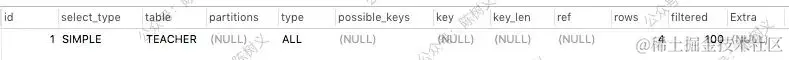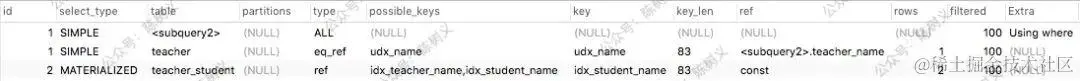 上面的输出一共有 3 条记录,其中第 1、2 条的 ID 相同,第 3 条 ID 不同。那么其执行顺序就是 ID 值越大,其越早执行。ID 相同的,按顺序执行。上面的例子,最早拿 teacher_student 表的数据,之后是一个子查询组成的表,最后拿 teacher 表的数据。结合 SQL 分析,这也符合我们的常识。因为我们必须先把子查询的值算出来,因此需要先把 teacher_student 表里的数据拿出来,之后才可以拿去 teacher 表里查询。