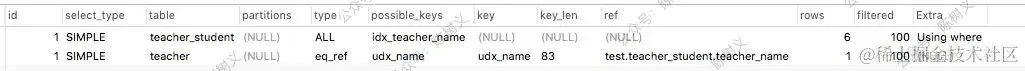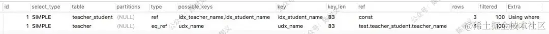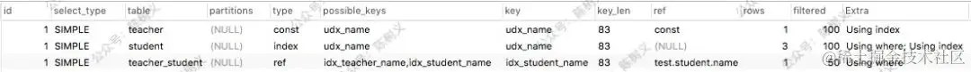 可以看出其 3 个查询都是简单(SIMPLE)查询。因为 ID 相同,所以其查询顺序是按顺序来的。首先从 teacher 表中取出数据,之后从 student 表取出数据,最后 teacher_student 表取数据。
