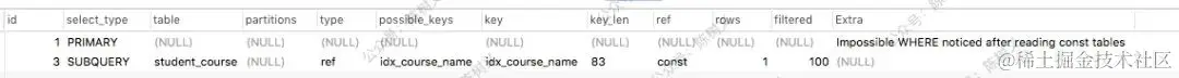 在上面的查询中,首先是执行 ID 为 3 的查询,即去 student_course 表取出选修了数学课的学生名字,之后再去进行最外层的查询。可以看到最外层查询的 select_type 为 PRIMARY。