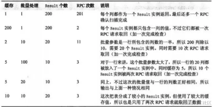 ② 缓存值决定一次RPC返回几个Result,根据Batch划分的Result个数除以缓存个数可以得到RPC消息个数(之前定义缓存值决定一次返回的行数,这是不准确的,准确来说是决定一次RPC返回的Result个数,由于在引入Batch之前,一行封装为一个Result,因此定义缓存值决定一次返回的行数,但引入Batch后,更准确的说法是缓存值决定了一次RPC返回的Result个数);