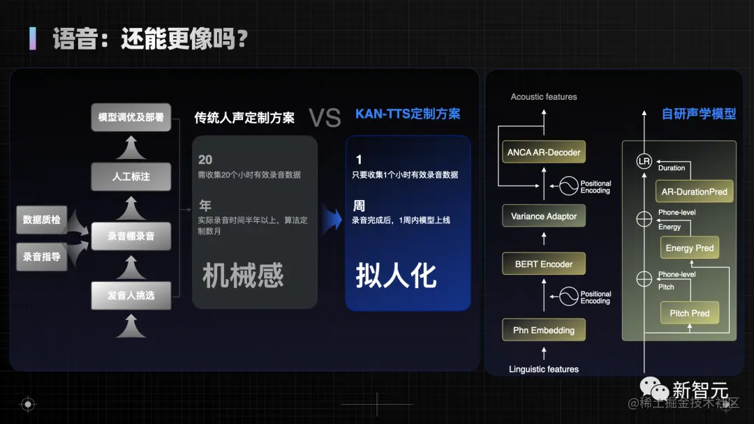 过去要定制一个人的声音,过程非常复杂,可能需要去录音棚里录 20 小时以上的录音,做大量的人工标注,再去做模型的调优和部署。可以说,曾经的定制声音,是以年为周期的。