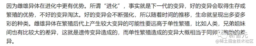 ta 会说:「雌雄异体是为了避免基因缺陷遗传,因为雌雄异体在进化中更有优势,好的变异会取得生存或繁殖的优势,不好的变异淘汰。」