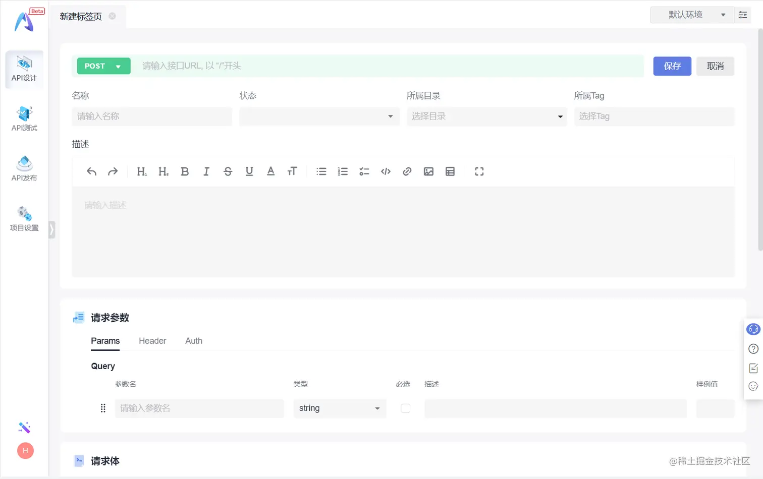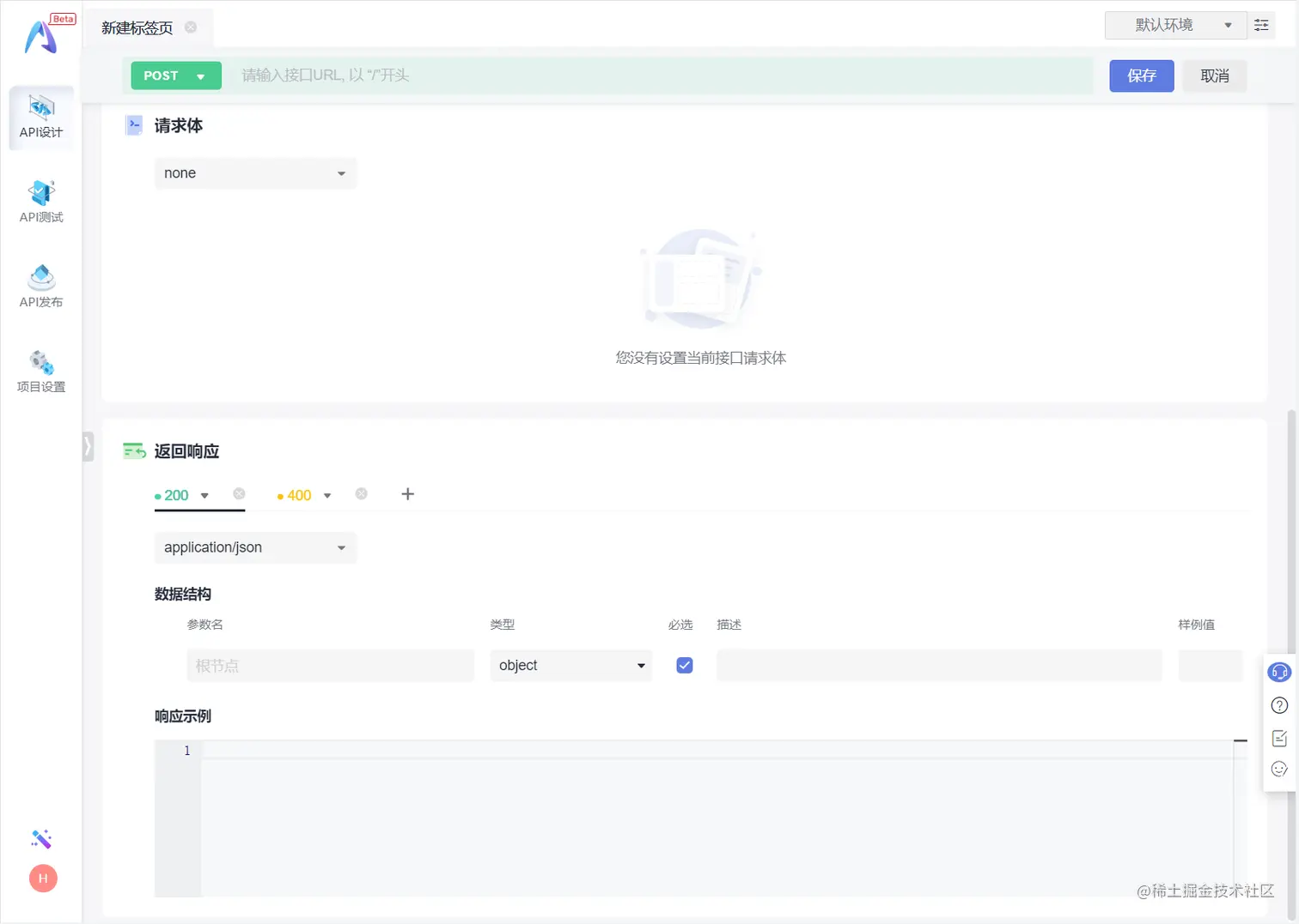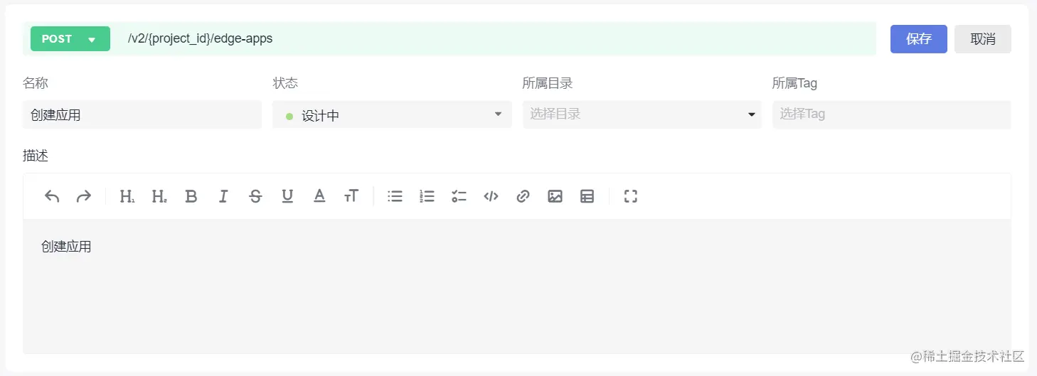 创建边缘应用接口是一个使用POST方法进行请求的接口,新建一个POST接口主要有四个部分:接口基本信息、请求头、请求体和返回响应。