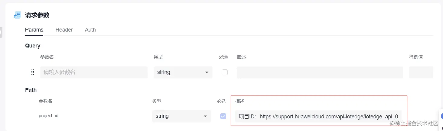 在路径中输入“/v2/{project_id}/edge-apps”后,请求参数会自动识别路径中的请求参数。