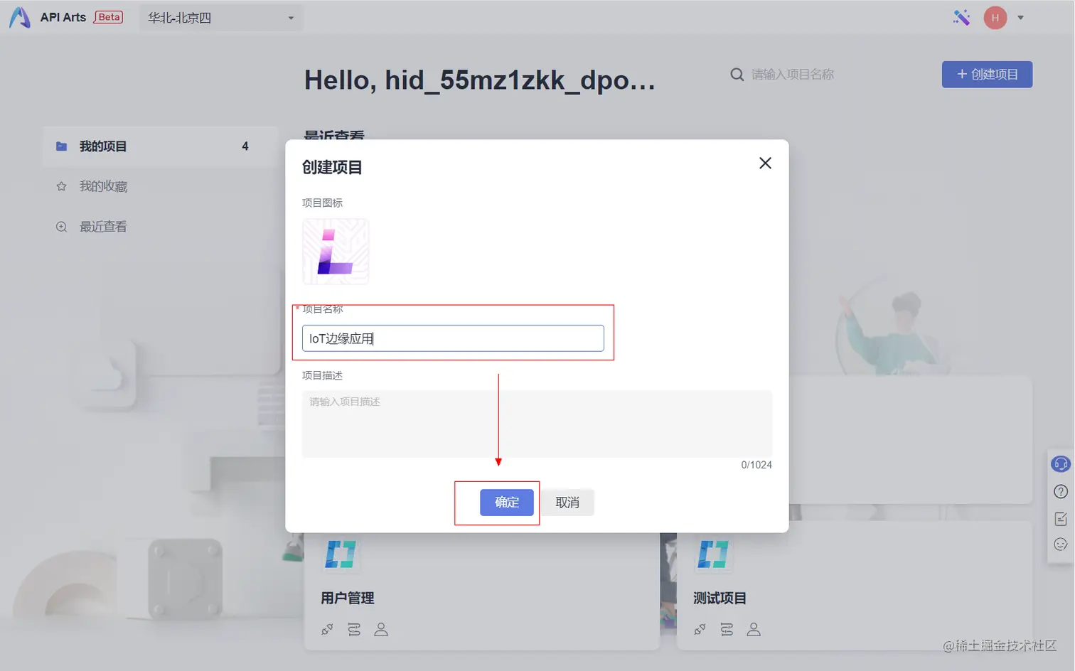 3.2 在新建弹窗内输入“loT边缘应用”,点击确定