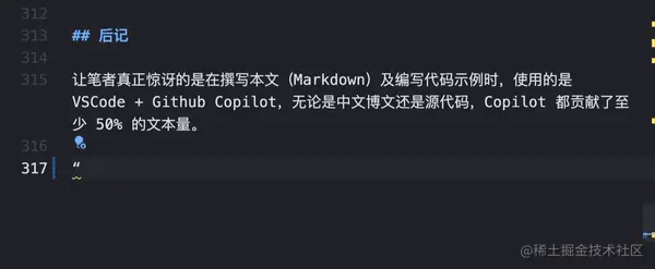 让笔者真正惊讶的是在撰写本文(Markdown)及编写代码示例时,使用的是 VSCode + Github Copilot,无论是中文博文还是源代码,Copilot 都贡献了至少 50% 的文本量。